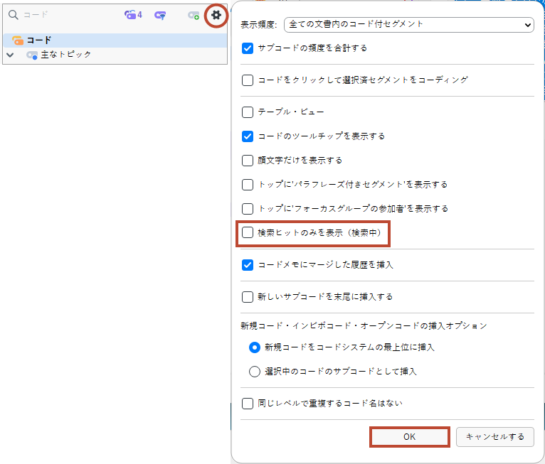 コードシステムはそのままに検索結果をハイライトしたい場合(検索ヒットのみを表示を解除したい場合)は、コードシステムの設定