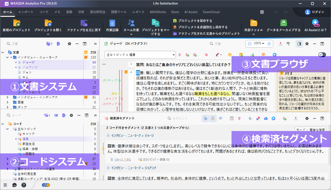 MAXQDAは、質的データ分析を支援するQDAソフトのひとつで、データの整理と分析の効率化に役立ちます。1989年のリリース以来、長期にわたり研究者に対して強力で革新的かつ、簡単に使用できる分析機能を提供しています。