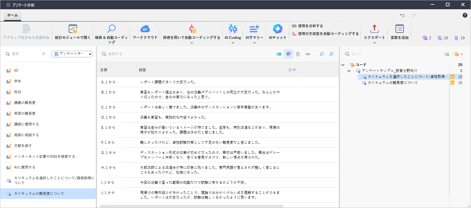 オープンエンド型の質問を選択すると、右側にすべての回答とコードの表が表示されます。回答を読み、コーディングを行い、回答の文脈を確認しながら直接サブカテゴリーを作成する操作が容易に行えます。上部のメインメニューには、ワードクラウド、AIアシスト、感情分析(英語、ドイツ語に対応)などの解析メニューアイコンがあります。