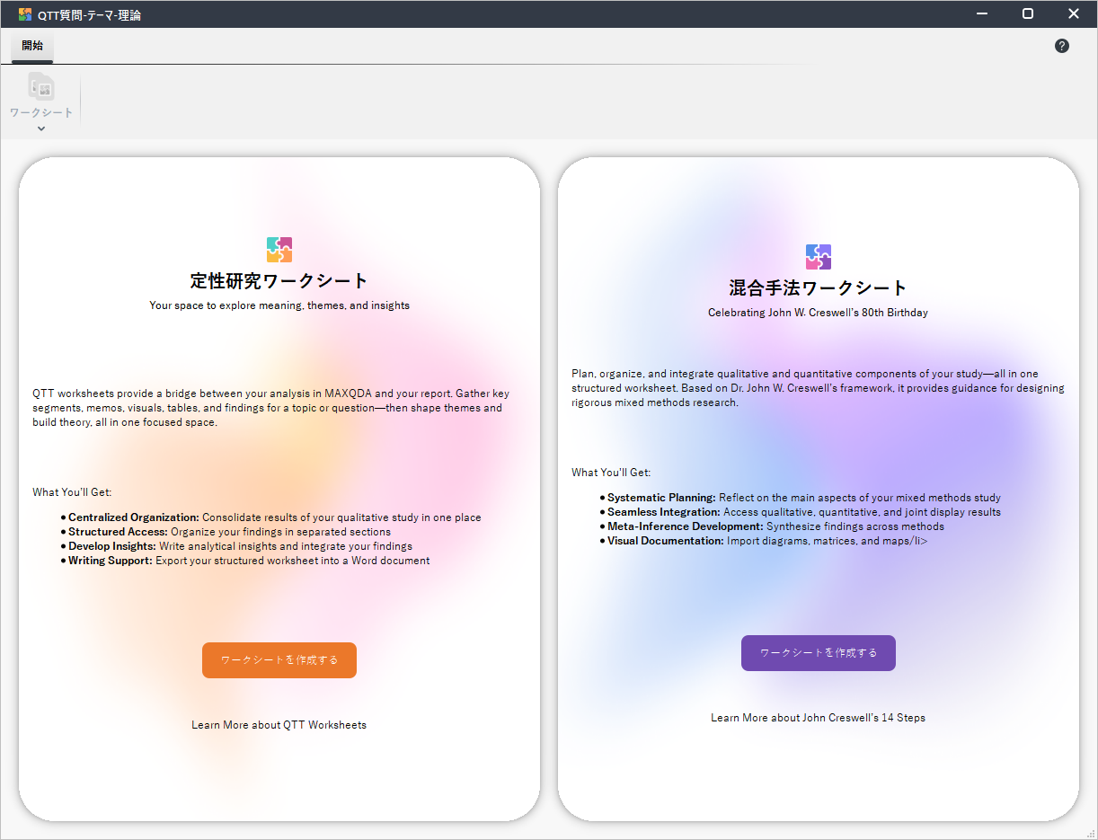 今回のアップデートでは、QTTワークシートを機能拡張をし、混合研究法のためのワークシートが実装されました。本機能は、混合研究法の第一人者であるJohn W. Creswell博士のフレームワークにインスパイアされています。