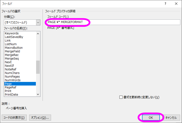 [PAGE\*MERGEFORMAT2] と [PAGE\*MERGEFORMAT] のどちらも「ページ番号をページ番号の書式設定で入力」するコードです。ただし、Wordのバージョンによっては [PAGE\*MERGEFORMAT2] に非対応のためこのエラーが発生します。