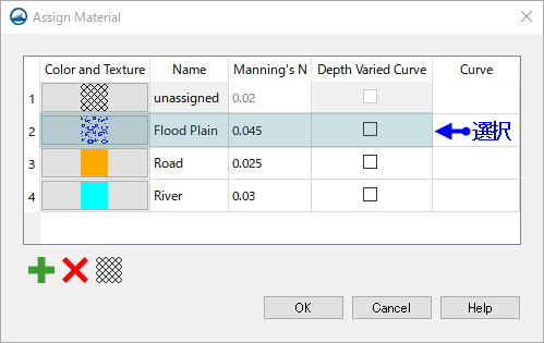 SRH-2Dシミュレーションでは、Material Propertiesダイアログで関連付けされたマテリアルタイプを使用することができます。本シミュレーションでは、粗度の異なる3つのマテリアルタイプを設定します。