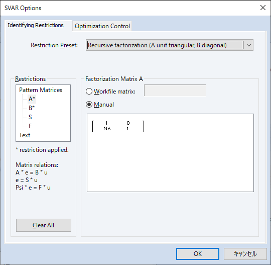 構造VARモデルの推定とそれに基づくインパルス応答分析を行いたい場合、いったん上記の標準的な手順でVARモデルを推定した後、VARオブジェクト上でProc > Estimate Structural Factorizationと操作し、制約を指定します。制約は事前に行列オブジェクトを作成することでも指定できますが、ここでは簡単に、デフォルト設定で操作を実行してみます。