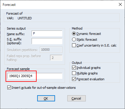 8以前のEViewsでは、VARモデルからの予測にモデルオブジェクトを介する必要がありました。しかしEViews9以降では、これまで説明してきたARIMAモデルの場合と同様に、推定後にForecastボタンを押すだけで予測ができるようになりました。事前にRangeからワークファイルを拡張することで任意の期間まで予測を延長することができますが、ここでは簡単に、サンプル期間を2005Q4まで伸ばしてOKします(Forecastボタン関連の操作については第1回、第2回と変わりませんので、そちらをご確認ください)。
