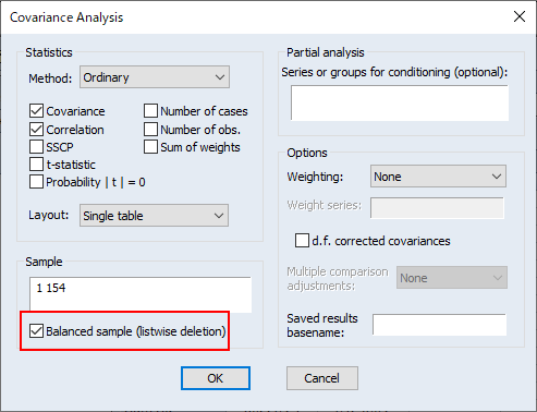 Sampleボックスでは、補間を実行するサンプルを選択できます。空白のままにすると、デフォルトのワークファイルサンプルが使用されます。選択したサンプル外の観測値は補間されず、補間計算にも使用されないことに注意してください。Insert source series for out of sample observationsチェックボックスは、出力シリーズにサンプル外観測値のソースシリーズ値を入力するか、NAを入力するかを制御します。