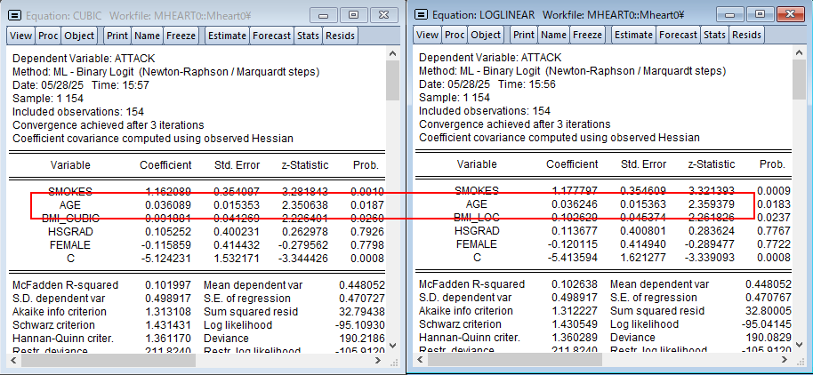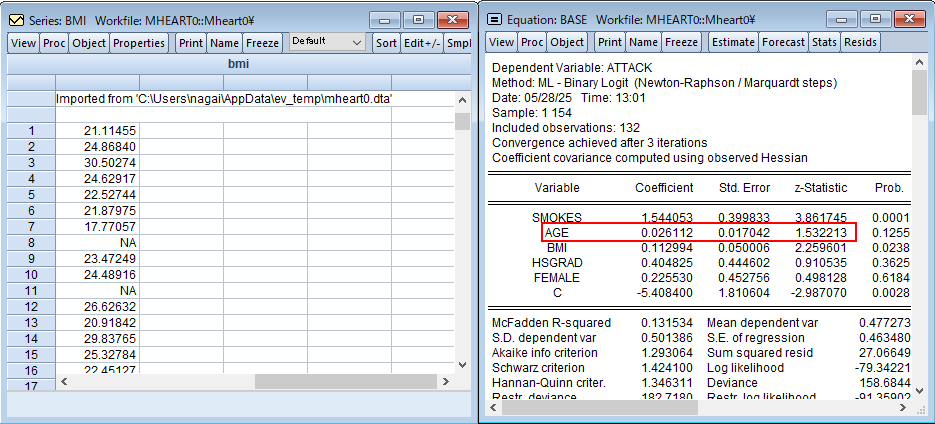 補完されたBMI_LINEARを使って再推定すると、AGEのP値が0.126から0.018になり、有意になっていることがわかります。