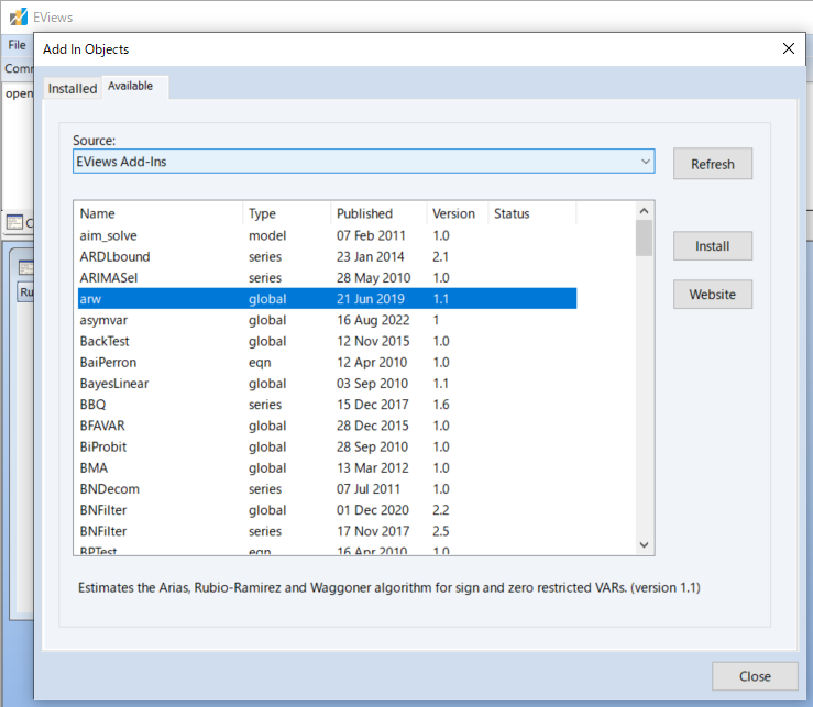 ユーザは、EViewsの機能を追加するパッケージ化されたアドインをインストールすることで、すぐにそのメリットを享受できます。ウェブサイトで利用可能なアドインは、ワンクリックでダウンロードしてインストールできます。今後もさらに多くのアドインが追加される予定です。