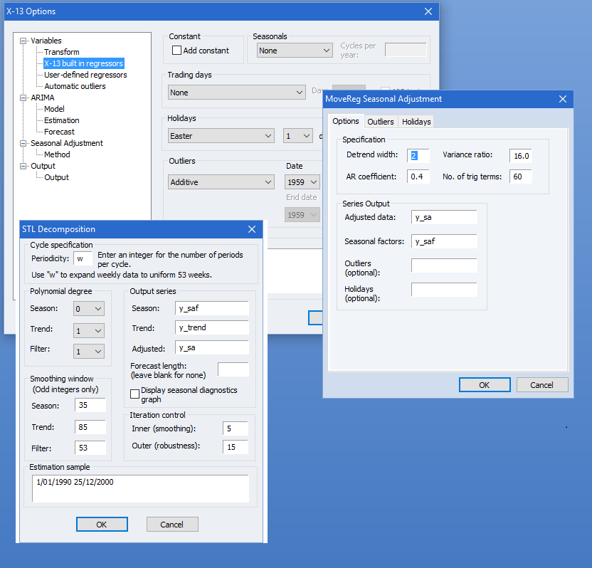 季節調整プログラムであるU.S.Census Bureau's X11/ X12-ARIMAおよびヨーロッパの研究者が好むTramo/Seatsを内蔵しています。もちろん、これらの機能はEViewsのインタフェースを介して利用できます。これらの高度な機能の他に、単純な加法、乗法差分方式も用意しています。