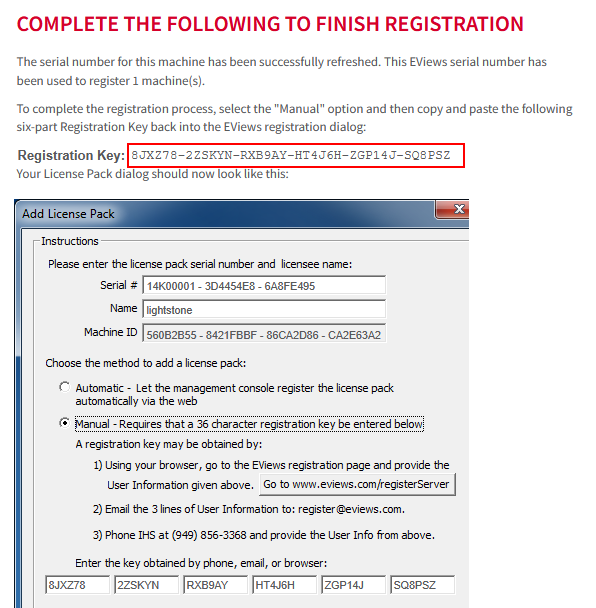 インターネット接続のないPC/ライセンスサーバでEViewsを使う場合や、セキュリティの問題でEViewsが開発元の登録サーバに接続できない場合は、マニュアル登録を行います。