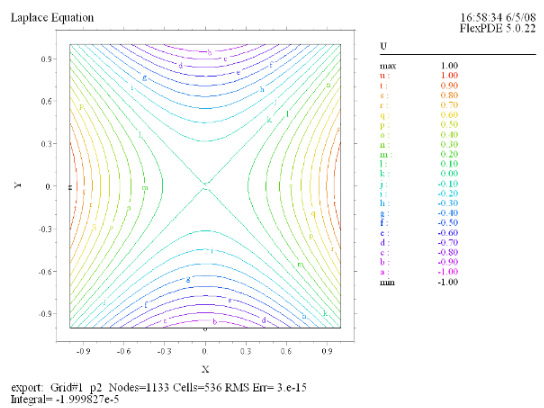 という関数を想定し、境界上でこの関数値を指定することにします(Dirichlet型境界条件)。もちろんFlexPDEはこれが厳密解であることなど認識できるわけではないので、ひたすら有限要素法に基づき数値解を計算します。 |