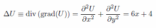 という解を想定した場合、第1項の 2*x*y は調和関数(ラプラス方程式を満たす関数)ですから、ラプラシアンは0となります。従って数式(5)の f(x, y) に寄与するのは第2項の (x^3 + 2*y^2) の部分のみということになります。従って解(6)が満足するポアッソン方程式は次のようになります。 |