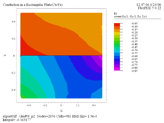 これまでは均一な材質からなるオブジェクトのみを扱ってきましたが、FlexPDEでは材質が連続的に変化する場合や不連続に変化する場合も容易に扱えます。ここでは右図に示すように上半分は銅、下半分は鉄からなる金属プレートを考えることにします。ハッチングを施した境界は絶縁されているとし、左上隅に