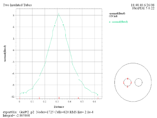 次に境界上における熱流束密度ベクトル f の 法線成分 fn の値をElevationコマンドによりプロットしてみます。グラフの形状もさることながら、プロット下部に出力されるその積分値に意味があります。外界に流出して行く熱量と温水チューブから流入して来る熱量とがバランスしていなくてはならないからです。 |