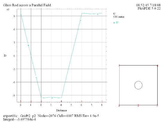 右図に示されるように、平行な電場の中に断面が円形のガラス棒を置いたときの場の変化について考察します。この場合にポイントとなるのはドメインの左側境界と右側境界において