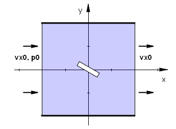 今度は流れの中に平板を斜めに配置したときに、平板にかかる力について分析してみます。流れについてはこれまでと同一の条件、すなわち入口での流速 vx0、圧力 p0、出口での流速 vx0 を仮定します。板の流れに対する角度を α 、板の幅と厚みをそれぞれ a = 0.5, d = 0.1 としたとき、板の4隅の座標値は次のように与えられる点に注意してください。なお、ここでは α = PI/6 のケースについて計算を行います。