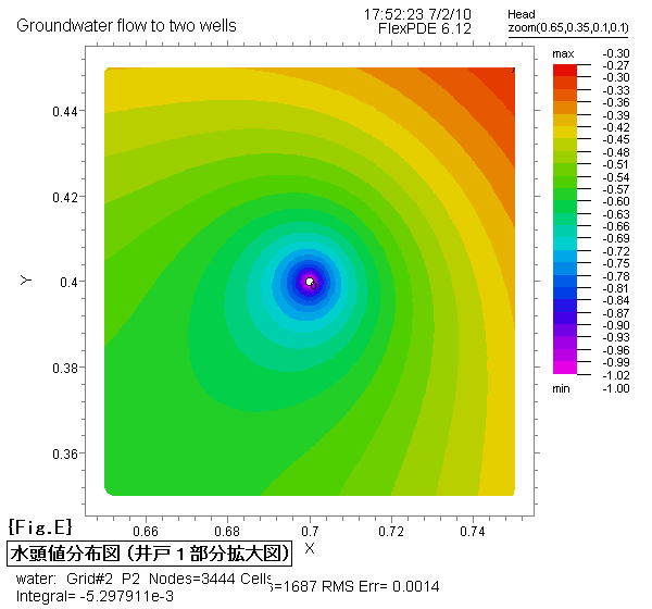 Fig.D}に水頭値を色分けした分布図を示します。 図中に青色枠線で示します井戸1付近の部分拡大図を{Fig.E}に示します。