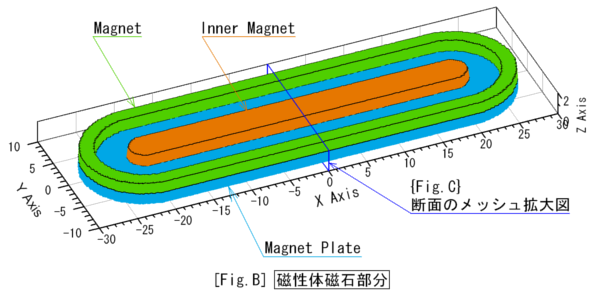 解析領域の全体メッシュ図を [Fig.A]、磁性体磁石部分を [Fig.B]、[Fig.B] 図中に青色枠線で示します部分の断面メッシュ図を {Fig.C} に示します。