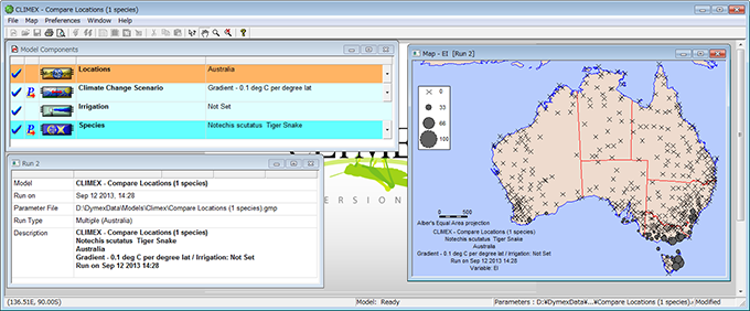 ユーザは複数の地図、グラフ、表を複数同時に表示でき、また、オプションとして1つないし2つの種を実行するように設定できます。このパッケージは気象データや地図のカスタム化を行えるMetManagerとMapManagerモデルを使用しています。CLIMEXはグラフを描画でき、ドロップダウンメニューや簡単に使用できるダイアログボックスと詳細なオンラインヘルプシステムを兼ね備えています。