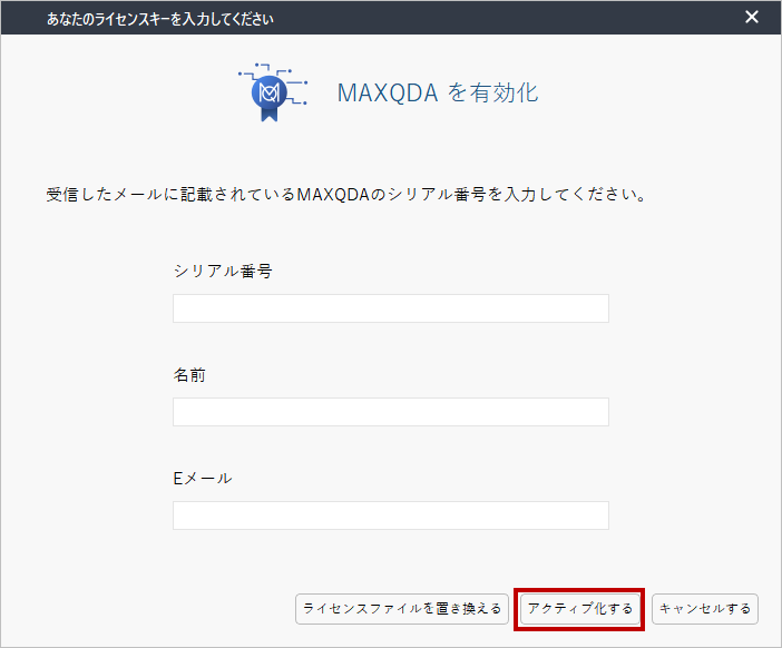 - 後日、開発元でアクティブ化したライセンスファイルをお送りいたします。ライセンスファイルを出力した後にオンラインアクティベーションを行うとエラーの原因となりますので、MAXQDAを起動せずにお待ちください。