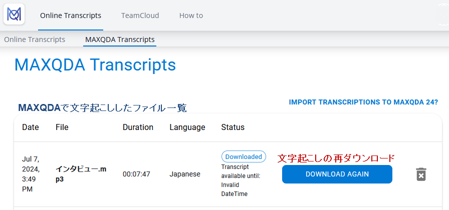 MAXQDAの中で文字起こしを実行した場合でも、WEB版文字起こしページにデータが残っています。MAXQDAアカウントにログインして、文字起こしデータをダウンロードいただけます。操作手順は、「インターネットブラウザで文字起こししたい」をご覧ください。