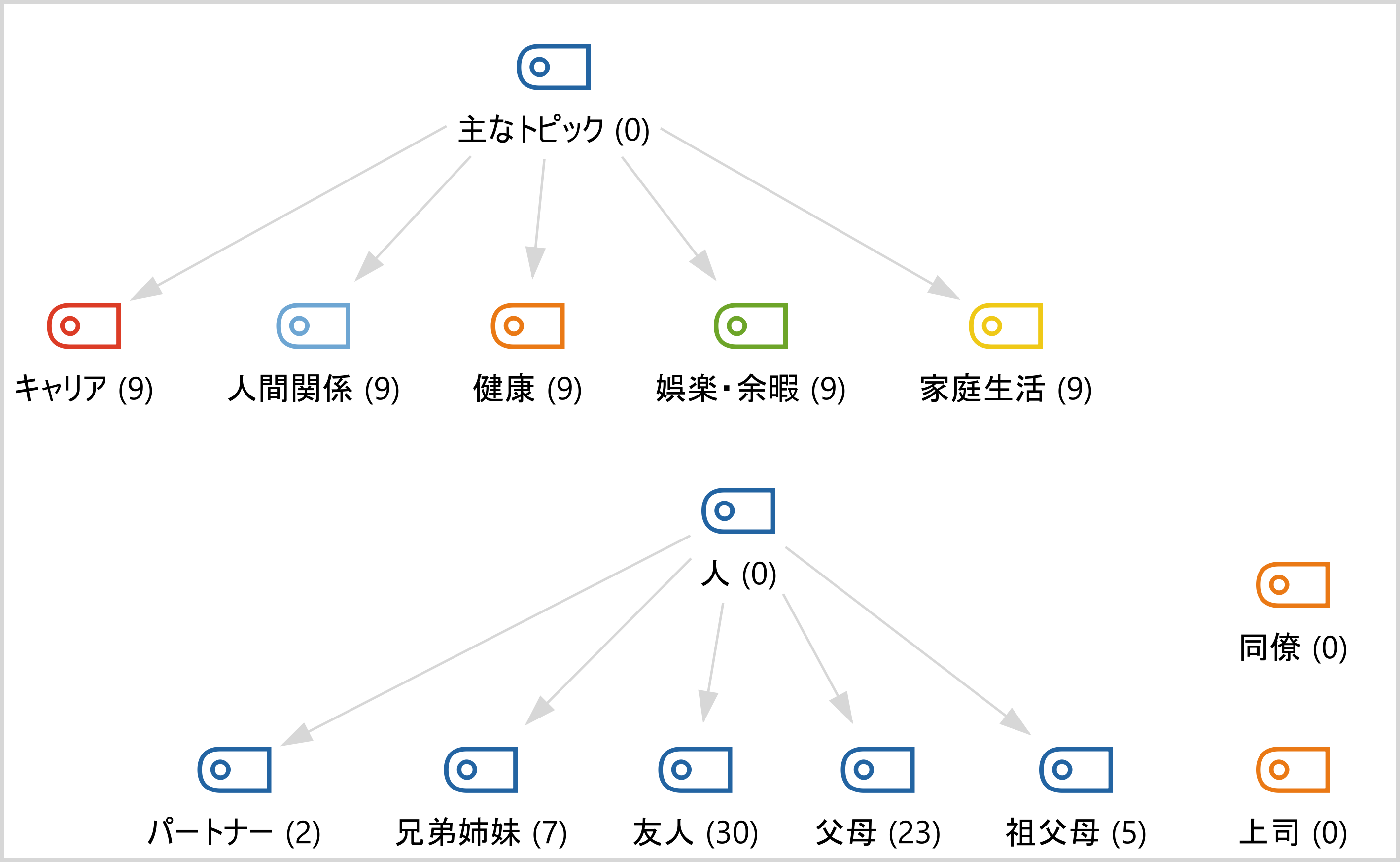 机の上でカードを並べるような感覚でカテゴリ化を行えます。コードの追加や統合などの操作も簡単に行うことができ、コードの整理に役立ちます。