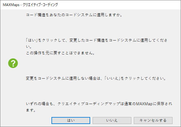 はい:クリエイティブ・コーディングウィンドウでの編集を、コードシステムに反映させます。クリエイティブ・コーディングが図としてMAXMapsに保存されます。