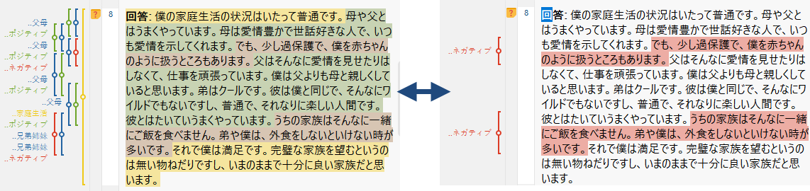 コードが増えて見辛い場合は、指定した色のコードのみ文書ブラウザやコードシステム(後述)に表示することができます。