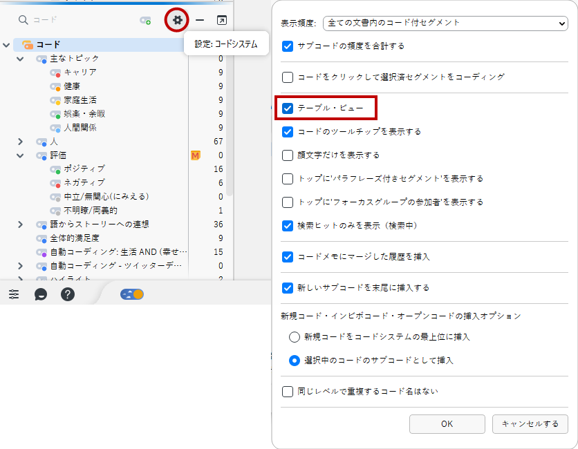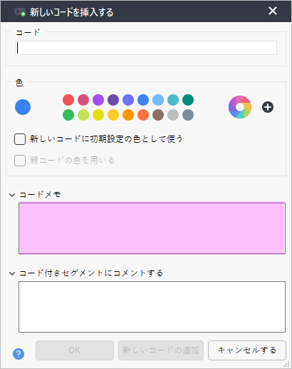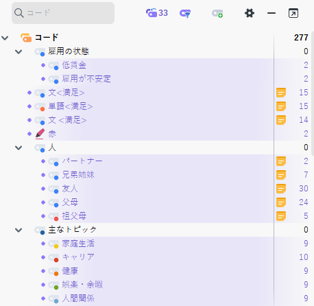 各コードには、色を設定することができます。独自に設定した基準で色分けをしながらコーディングすると、後の分析に役に立ちます。