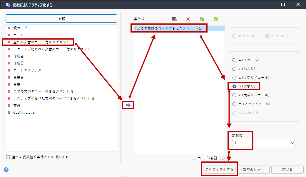 をクリックします。右で>(大なり)を選択し、変数値に「1」と半角数値で入力します。条件式に「[全ての文書のコード付きセグメント]>1」が入力されます。これは、「コード数が1より多い」を意味します(2以上「≧2」と設定しても問題ありません)。