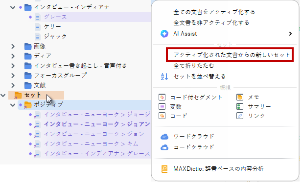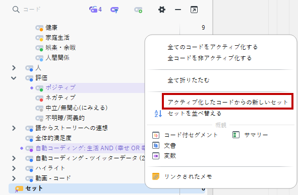 コードシステムとは別にコードをグループ分けできます。セットを右クリックし「新しいセット」を作成します。新規セットにコードをドラッグ&ドロップします。セットは、コードシステムのコードへのリンクとなります。セットで整理したコードもコーディングに利用できます。