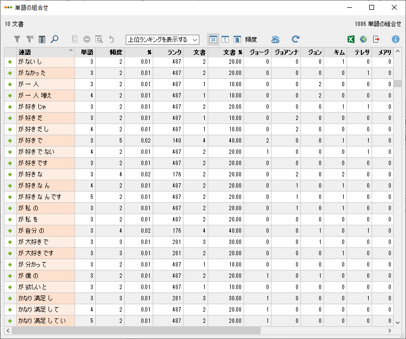 「辞書の項目を検索する」を指定すると、辞書に登録した各単語を計数します。カテゴリごとに集計することもできます。