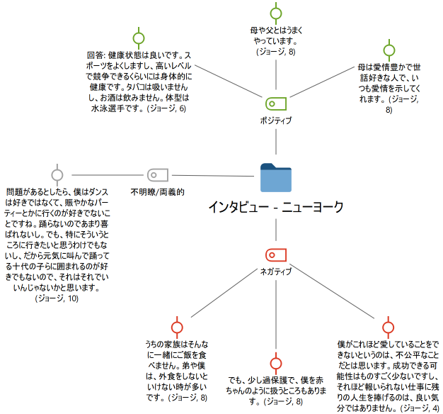 一事例(ひとつの文書グループ、文書、セット、フォーカスグループ)について、コード付きセグメントやサマリーなどを図示します。