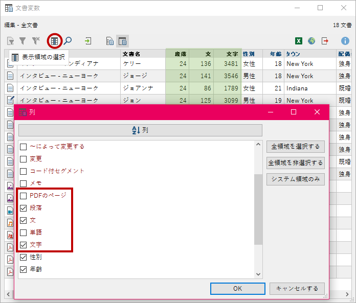 MAXQDA2022以降では、システム変数に「PDFのページ数」「段落」「文」「単語」「文字」が追加されました。MAXQDAが各変数を自動的に計数します。Word、PDF、テキストファイルのテキスト量を確認したい場合に便利です。