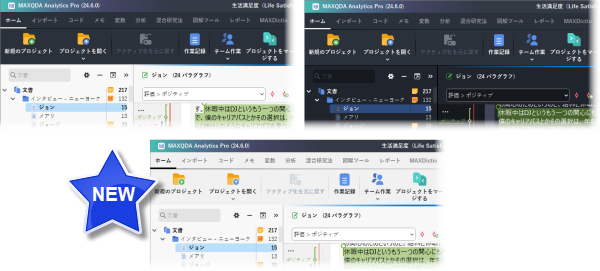 旧バージョンMAXQDA 2022では、1つの文書に対してのみ単語の出現頻度を調べることが可能でした。MAXQDA 24では、複数の文書に対して単語の出現頻度の違いを可視化できるようになりました。この機能により、時間の経過に伴う話題や言語ニュアンスの変遷を簡単に調べることができます。