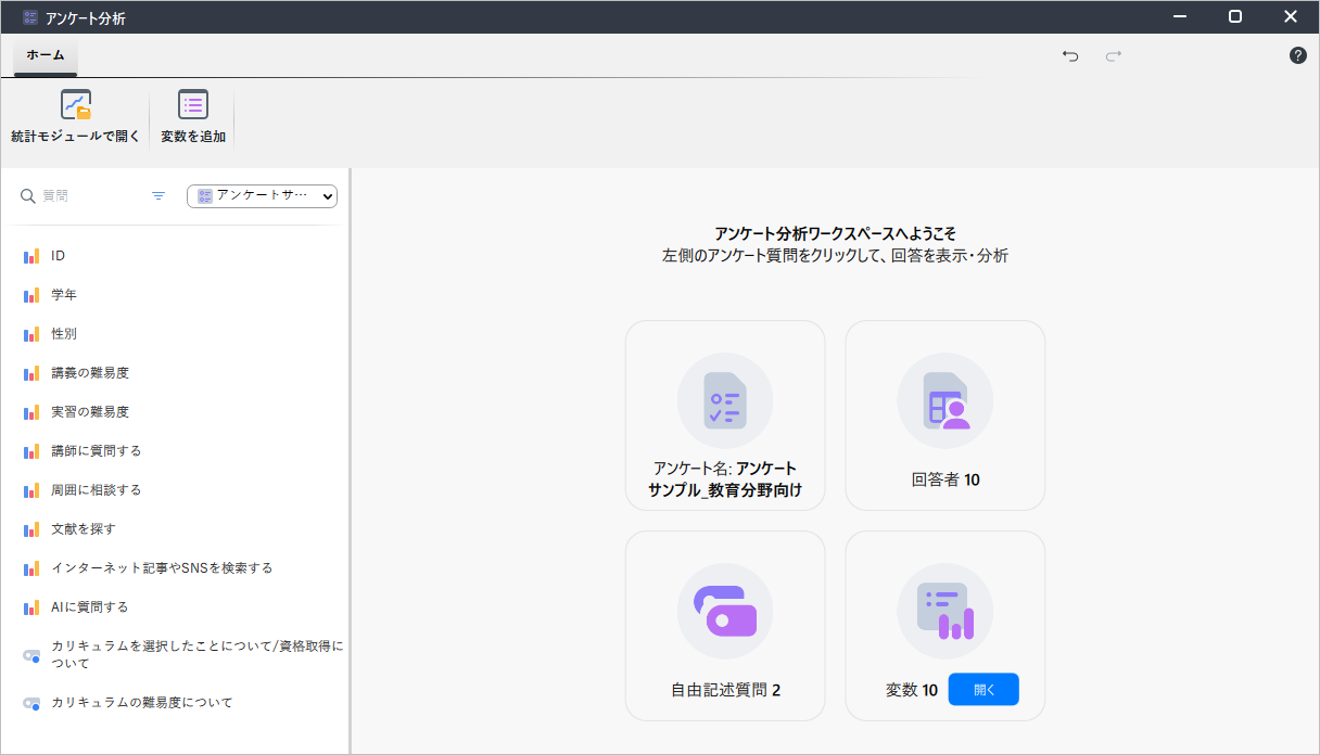 このワークスペースの左側には、すべての質問項目(オープンエンド型、クローズエンド型両方の質問項目)が表示されます。