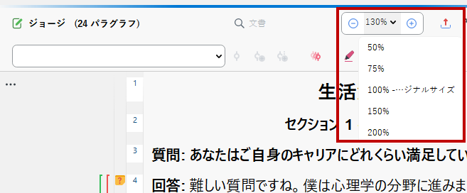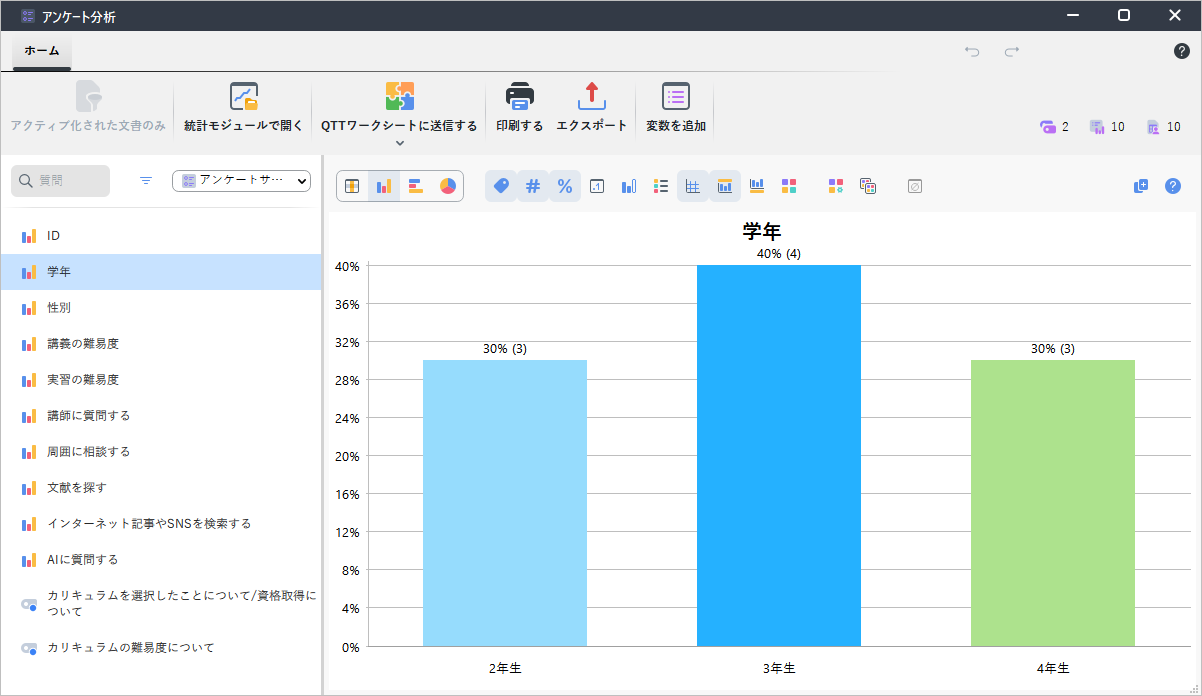 クローズエンド型の質問も同じ様に簡単に扱えます。左側の質問項目をクリックすると、右側に頻度とパーセンテージのグラフが表示されます。グラフ形式にも、降順/昇順に並べ替え可能な表形式にも表示を切り替えることができます。