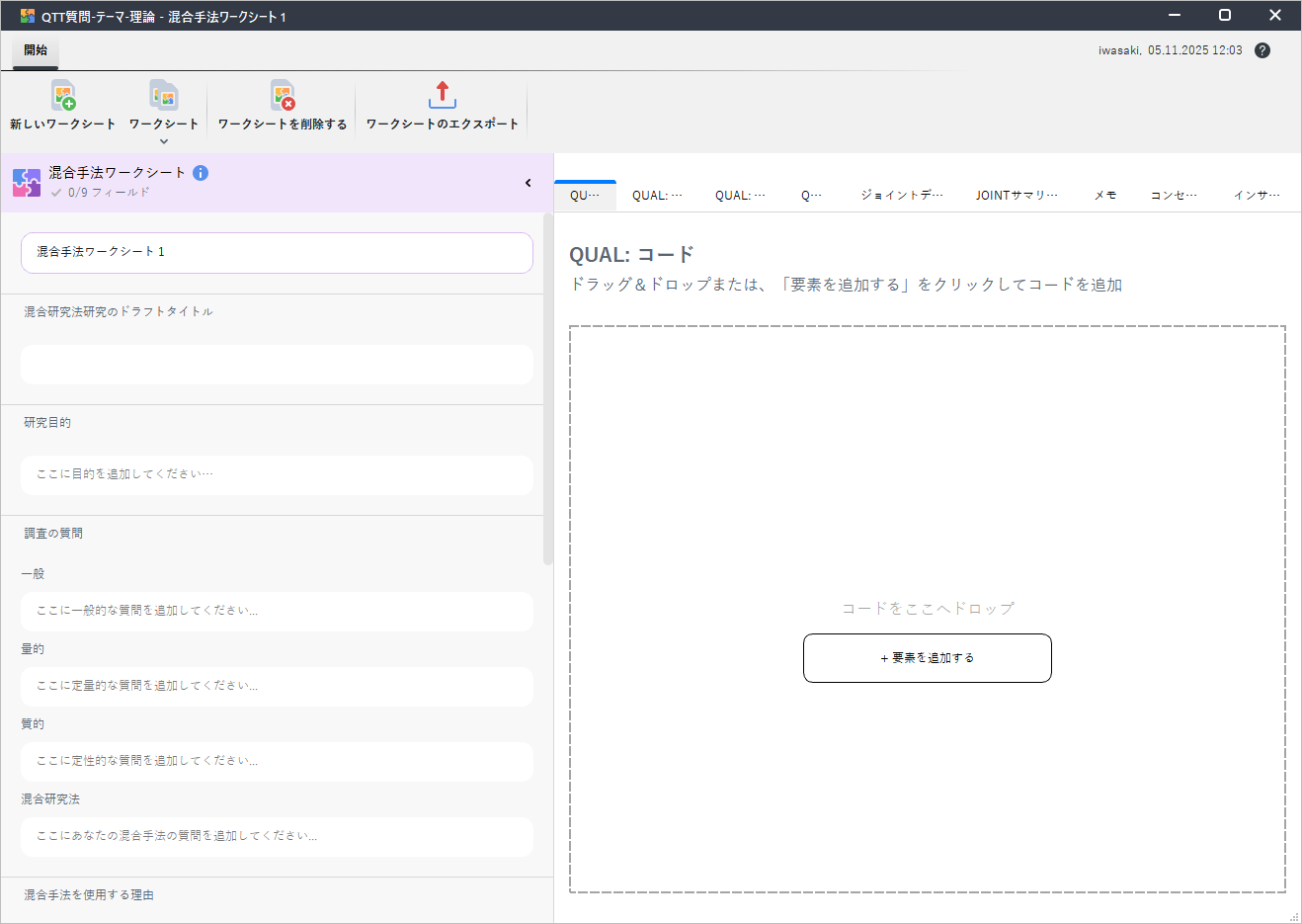 今回のアップデートでは、QTTワークシートを機能拡張をし、混合研究法のためのワークシートが実装されました。本機能は、混合研究法の第一人者であるJohn W. Creswell博士のフレームワークにインスパイアされています。