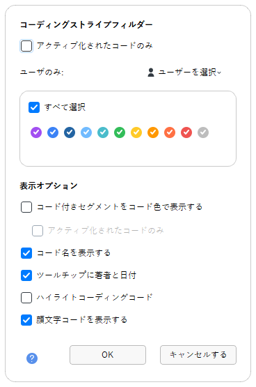 オープンエンド型の質問を選択すると、右側にすべての回答とコードの表が表示されます。回答を読み、コーディングを行い、回答の文脈を確認しながら直接サブカテゴリーを作成する操作が容易に行えます。上部のメインメニューには、ワードクラウド、AIアシスト、感情分析(英語、ドイツ語に対応)などの解析メニューアイコンがあります。