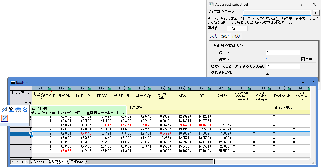 Originでは、数値データに対するカーブフィッティングに加え、統計領域における多様な回帰ツールをサポートしています(一部、無料アプリを利用する機能です)。