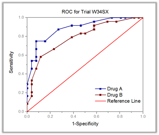 診断や検査の精度を評価・比較するための受信者動作特性(ROC)曲線。曲線下の面積(AUC)によるテストの評価や、診断手法を改善するための「最適カットポイント」の算出が可能です。
