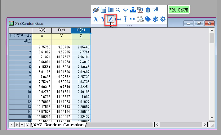 - ワークシートにX、Y、Zデータを用意します。Zデータ列をクリックしてミニツールバーを使ってZ属性に設定します。