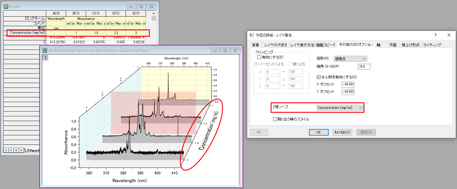 Originのウォータフォールグラフでは、オフセットする量をラベル行に入力されている値で制御できます。例えば、異なる濃度ごとに計測したデータをグラフ化したい時に便利です。