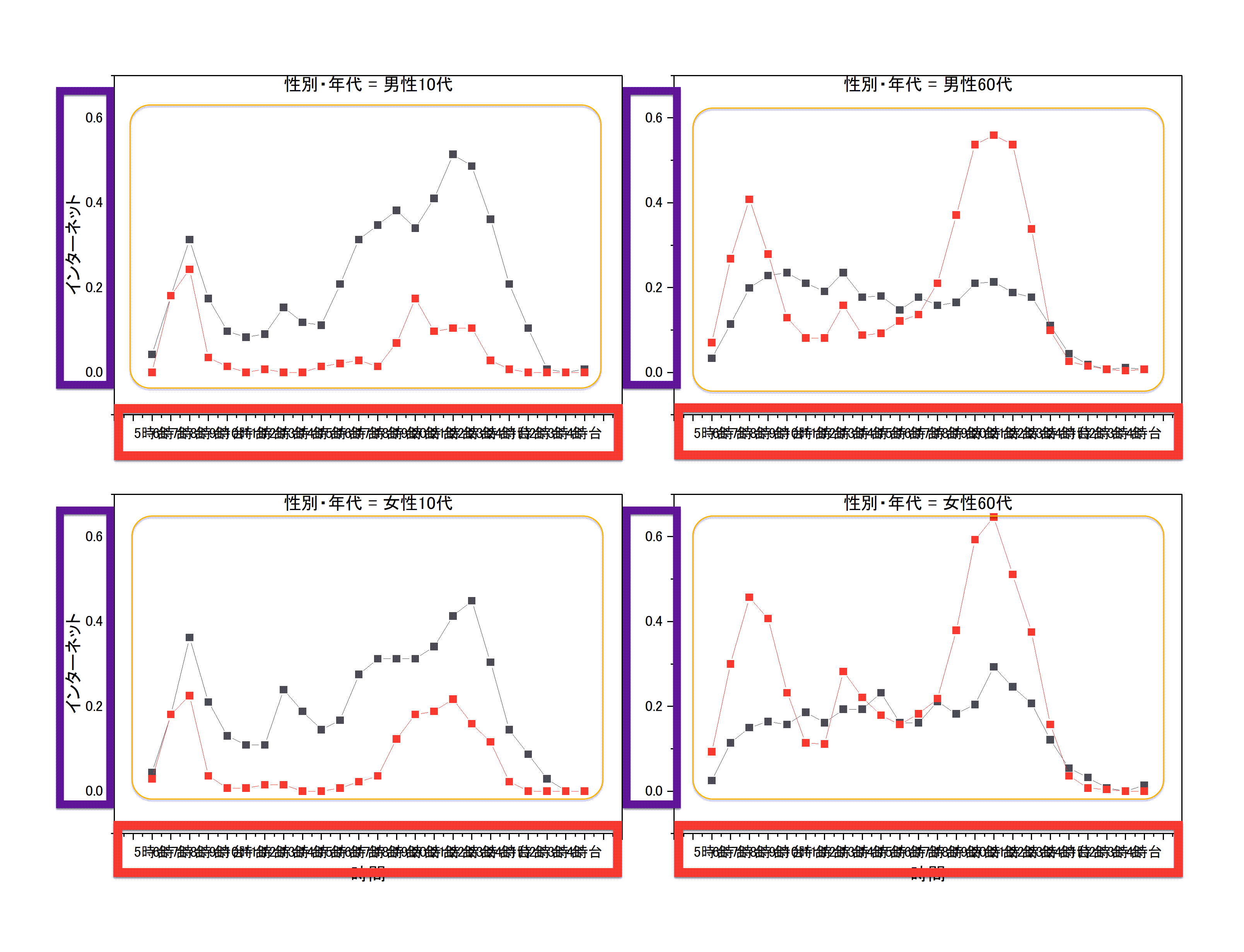 「レイヤを分ける変数」では各グラフをどの変数によって分けるかを決定します。今回のグラフでは男性10代、女性60代、のように性別・年代別でレイヤを分けているため、B列の“性別・年代”を選択しています。