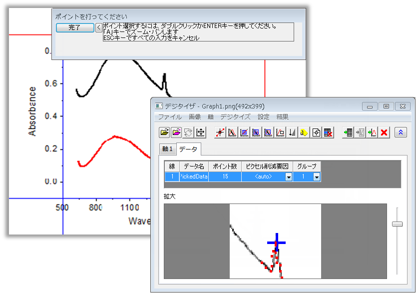 論文や文献などの「グラフの画像ファイル」からデータポイントの数値を読み取ってデータ化する「デジタイザ」機能を搭載しています。一般的な直交座標のグラフだけでなく、極座標や三角座標のグラフ画像からのデータ取得にも対応しています。
