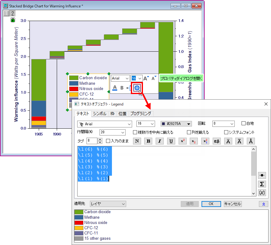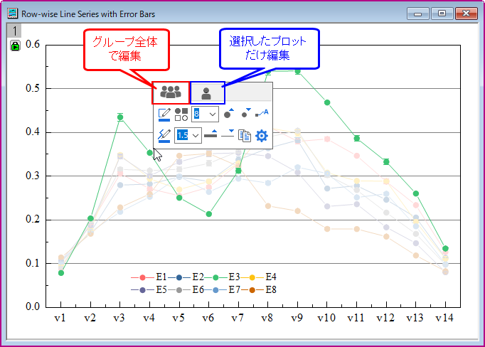 グループ化されたプロットは、グループ全体での編集はもちろん、個別のプロットでも編集できます。また、設定ボタンを押してダイアログを開けば、詳細な設定も可能です。