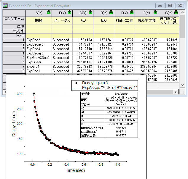 1つのデータセットを複数の関数でフィットし、F検定やAIC/BIC検定を使ってフィット結果を比較