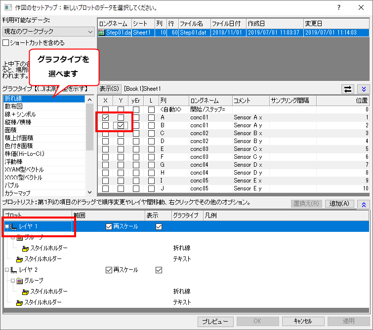 下パネルで「レイヤ1」をクリックしてから、レイヤに追加したいXYデータを中央パネルで選びます。下図ではA-Bの対を選択しています。