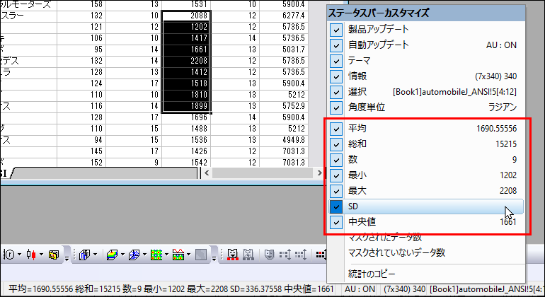 表示する統計量は、ステータスバー上で右クリックして開くメニューで選択できます。チェックがついている項目が表示項目です。