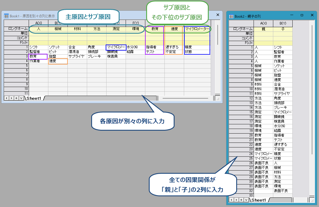 - では、Originで特性要因図を作成し、カスタマイズする方法を紹介します。まず、この機能がサポートしているデータ配置形式を簡単に見てみましょう。
