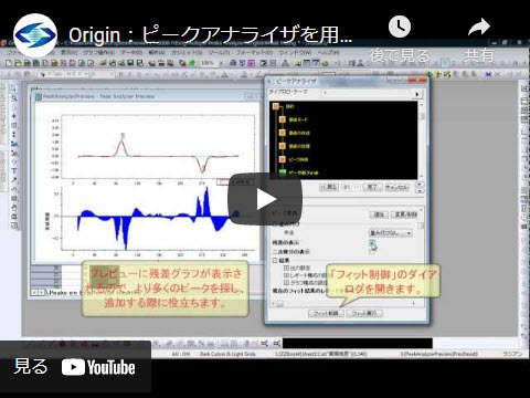 Originでピーク分析する場合ピークアナライザーを使用します。ピークアナライザーは、高度なピーク分析をステップ毎に実行できる直感的で対話形式のインターフェースを持つウィザードです。この項目では、ピークアナライザーを使用した分析の方法を紹介する動画をご用意しております。